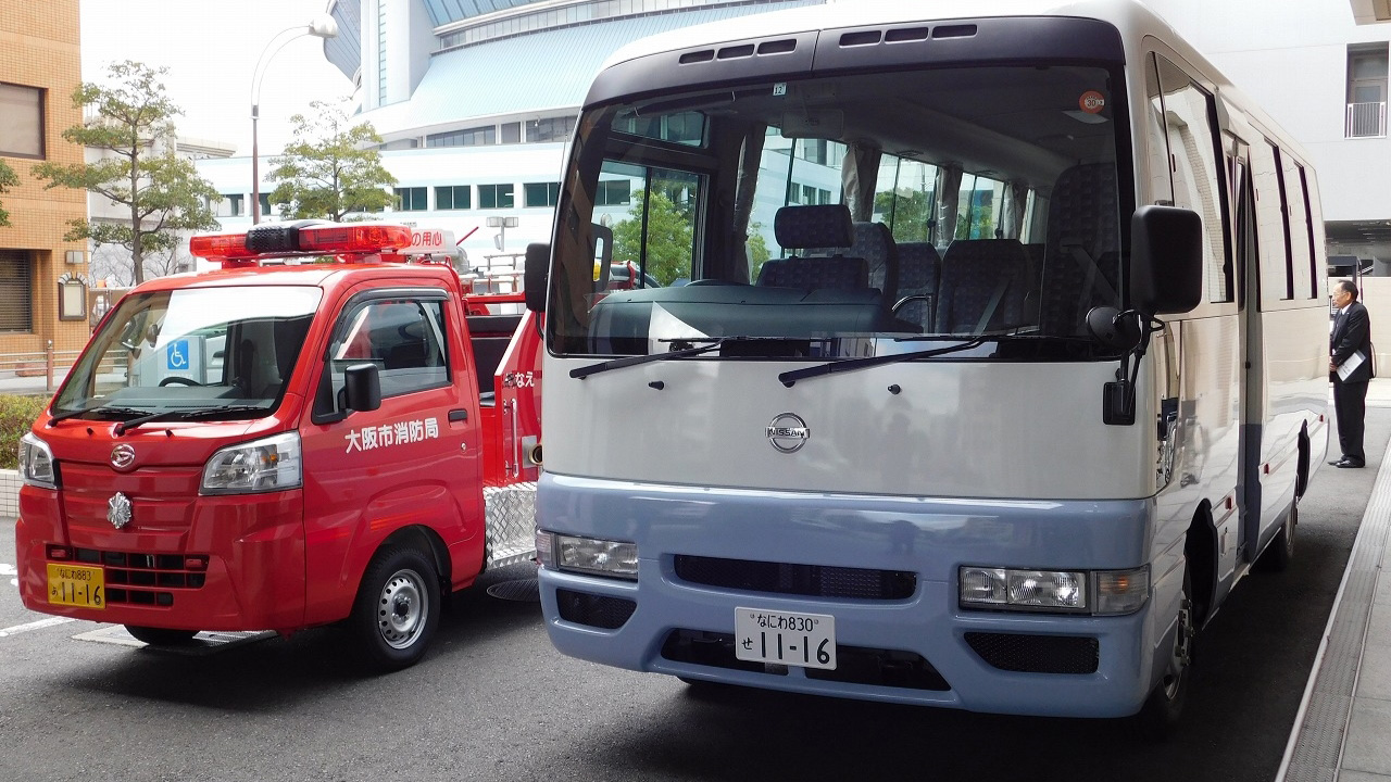 リーディングカンパニーとしての自負とともに、長年にわたって続けているのが寄付などの社会貢献活動です。2017年には、日ごろから地域を支えてくれる大阪市消防局に、感謝を込めてミニ消防車とマイクロバスを寄贈しました(=写真)。近年では、新型コロナウイルス助け合い基金や、ウクライナへの人道支援などにも寄付を行っています。