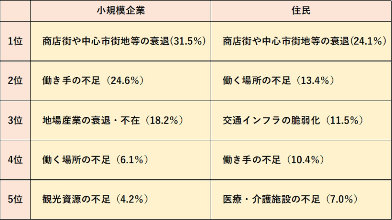 2019年にみずほ情報総研株式会社(現在はみずほリサーチ&テクノロジーズ)が小規模企業と住民を対象として実施した地域課題に関するアンケートの結果によると、双方とも「商店街や中心市街地等の衰退」が最も深刻な地域課題をしてあげています。