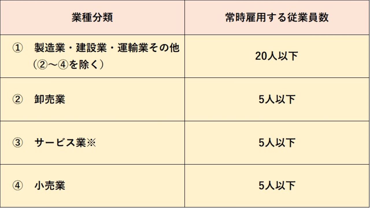 小規模企業とはどれくらいの規模の企業を指すのでしょうか。中小企業基本法によると、業種分類ごとに以下の規模の企業が小規模企業と定義されます。