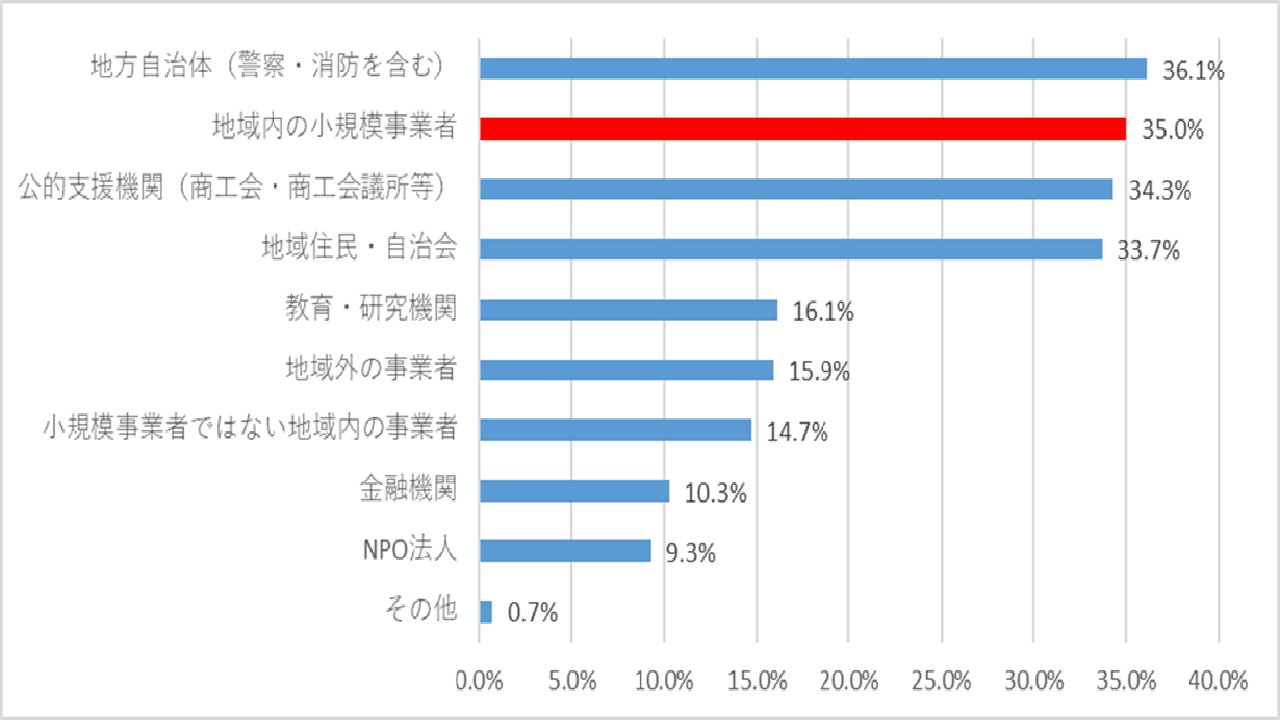 また住民に対する同アンケートで地域課題にあたり中心的な役割を期待されているのは地方自治体に続き「地域内の小規模事業者」が挙げられています。地方自治体と地域内の小規模企業との差はわずか1.1%と、地方自治体と同様に期待を向けられています。