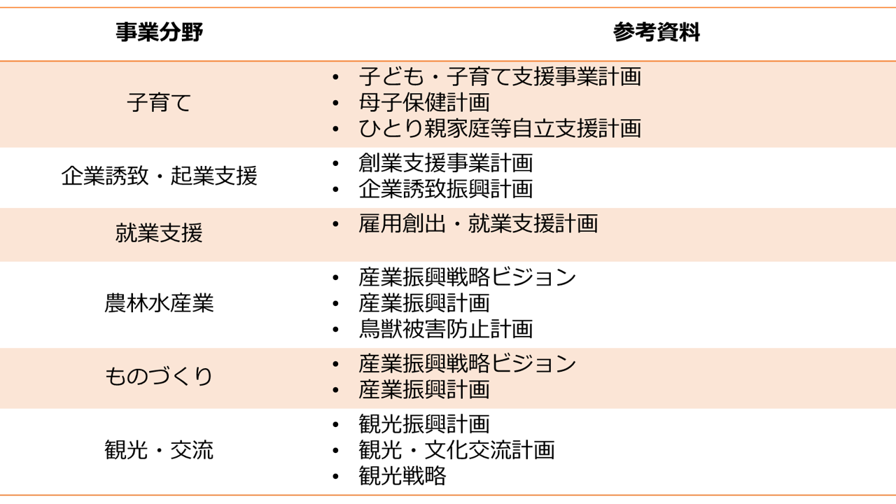 必ずチェックしてもらいたいのが各自治体の地域づくりの最上位に位置づけられる「総合計画」と人口急減・超高齢化という課題に対して、各地域が特徴を生かした取り組みの戦略をまとめた「まち・ひと・しごと創生総合戦略」です。