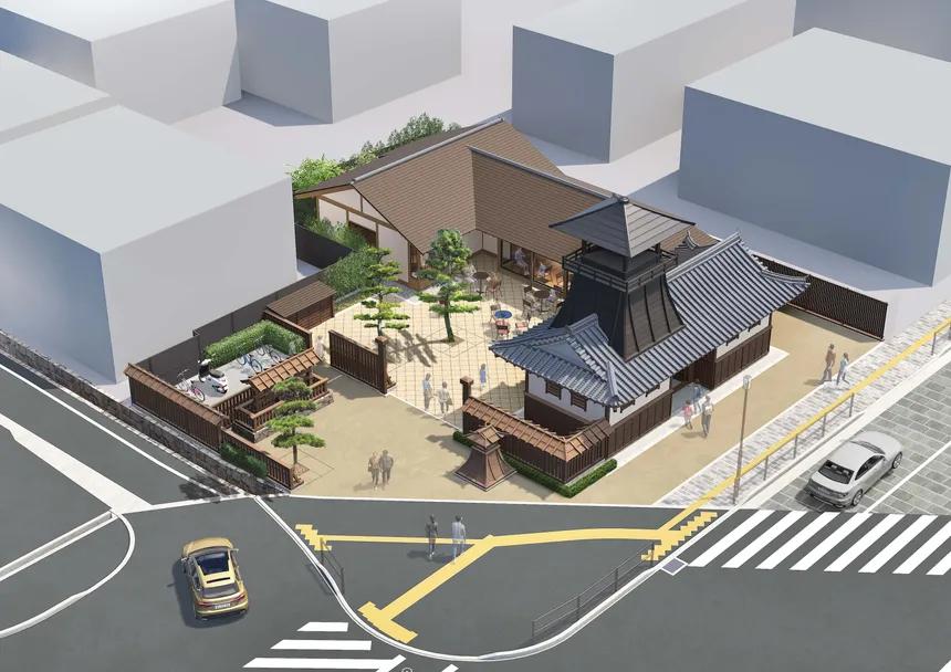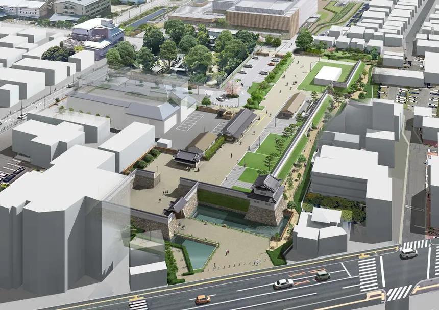 【令和8年度末に北エリア一次オープン予定 かつての城下町の、歴史あふれる情景を再現!】 かつて北摂唯一の近世城郭として重要な役割を果たした高槻城。その城下町は、大坂城、岸和田城とともに府内三大城下町として繁栄していました。 その高槻城があった市民会館跡地等を「高槻城公園北エリア」と位置付け、城下町の風情等を再現します。一次開園エリアには、現存する絵図等に基づいて、高槻城を構成した土塁や土塀を再現します。また休憩所となる東屋や武家屋敷広場等を整備するとともに、民間飲食店なども誘致します。二次開園エリアには、写真にある乾櫓や高麗門、堀を整備します。 この新たなシンボルエリアの創出により、高槻市のにぎわいと品格の向上を図るとともに、シビックプライドの醸成につながる取組を推進します。
