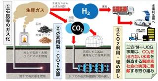 本事業は大きく3つの項目から構成されています。 ①石炭の地下ガス化 三笠市内の地下には未採掘の石炭が大量にあることから、地下の石炭に直接着火し、その熱で周辺の石炭をガス化させる「石炭地下ガス化」を行い、発生したガスを回収し、燃料や水素製造の原材料として利用します。 ②採掘した石炭や木質バイオマスの地上でのガス化 木質バイオマスと、石炭を合わせて炉の中で加熱することで、可燃性ガスを取り出すことができます。なお、木質バイオマスは、CO2を吸収しながら生育するため、燃焼やガス化の際に発生するCO2は大気中のCO2濃度に影響を与えないカーボンニュートラルなエネルギーとされています。 ③取り出したガスからの水素製造 石炭や木質バイオマスをガス化させてできた可燃性ガスに含まれる水素の割合は20%程度ですが、同程度含まれる一酸化炭素(CO)と水蒸気を反応させて水素に転換することで、水素濃度を40~50%にまで増やすことができます。さらに、濃縮・精製などの行程を通して、燃料電池や水素自動車、あるいは水素ボイラなどで利用可能な純度の高い水素を製造します。水素製造時に排出されるCO2は分離・回収し、地下に戻し入れる(CCS/CCUS)、あるいは農業等で利用し、事業全体でのCO2排出量ゼロとなる水素製造を目指します。 CO2の地下戻入れ(地下固定)は、かつての石炭採掘跡にCO2を細かな泡にして水に溶存させた「CO2ウルトラファインバブル水」や、CO2と反応して固化する「CO2スラリー」を圧入し、地下にCO2を貯留・固定します。CO2ウルトラファインバブル水は坑内水より比重が重いので、坑内水の下に潜り込もうとします。また地下に残る石炭はCO2を吸着する性質を持っており、CO2スラリーと反応して地下で固まることから、地上にCO2が漏洩する心配はありません。このように、CO2地下固定を通して、地盤構造の安定化を目指すとともに、脱炭素への貢献を目指しています。 実証の記録映像等は下記URLをご覧ください。 https://www.city.mikasa.hokkaido.jp/hotnews/detail_sp/00014328.html ↑H-UCG事業詳細 https://youtu.be/Jj1PVRBovrg ↑令和6年度 CO2地下固定化実証(動画)