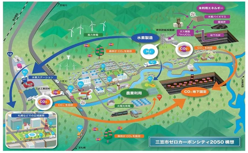三笠市は北海道のほぼ中央、空知地方南部に位置し、札幌市街から車で30分、新千歳空港からも車で1時間ほどと交通アクセスも良好です。約1億年前の「生命の痕跡」とされるアンモナイトの化石や、北海道という島の成り立ちを物語る垂直に隆起した地層、5,000万年もの年月をかけて生成された石炭など、地質学的にも貴重な地域です。 当市は、およそ150年前に石炭が発見されてから「炭鉱のまち」として栄えましたが、エネルギー需要の転換とともに鉱山の閉鎖が相次ぎ、一時は6万3,000人を数えた人口も、現在は約7,000人に減少しています。人口減少や高齢化が進むなか、まちの存続と発展を目指し、持続可能な地域づくりへの取組みを進めています。 当市には約7.5億トンの石炭が地下に眠っているといわれており、平成20(2008)年から未利用エネルギーの有効活用を目指し、石炭地下ガス化(UCG)の取組みを推進しています。現在は石炭のほか、同じく地域に豊富に存在する木質バイオマスを組み合わせた低炭素な水素製造事業として、H-UCG(ハイブリッド石炭地下ガス化)事業に取り組んでいます。水素製造時に発生する二酸化炭素(CO2)は、地下に残る石炭採掘跡へ埋め戻すほか、農業などで利用することによって、事業全体でのCO2排出量ゼロを目指すことで、地域資源を活用したエネルギーの地産地消や脱炭素なまちづくり、新たな産業・雇用の創出によるまちの活性化を目的としています。