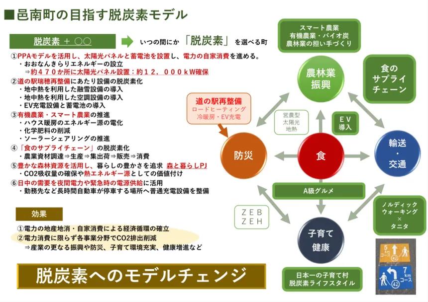 邑南町では、令和3年3月に「邑南町ゼロカーボンシティ宣言」を表明した後、地域新電力会社おおなんきらりエネルギーを設立し、令和4年4月には、環境省より第1回の脱炭素先行地域に選定され、再生可能エネルギーの地産地消による「環境」と「経済」を両立したまちづくりに取り組んでおります。 PPAスキームを活用した公共施設や事業所、一般家庭や農地での再生可能エネルギーの自家消費の促進や再整備を進める道の駅瑞穂での地中熱を活用した融雪・空調設備の導入、太陽光発電や小水力発電、小型風力発電など条件に応じた再生可能エネルギー発電設備を整備し、エネルギーの自給自足を目指しております。 また、ソーラーシェアリングを推進し、ハウス栽培等での加温など農産物の生産過程においても再生可能エネルギーを活用するなど、農産物の生産から集出荷、販売する産直施設までの各過程の脱炭素化に取り組むことにより、「食のサプライチェーン」の脱炭素化を促進します。 将来的には、ソーラーシェアリングで発電された再生可能エネルギーをEV車へ充電することも想定し、充放電設備を住宅や各種施設に整備することで再生可能エネルギーをEV車で融通させるなど、温室効果ガス排出を抑制した人やモノの移動を促進させる仕組みの構築を目指します。